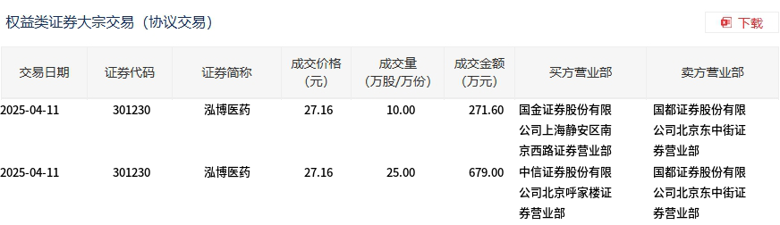 4月11日,泓博医药大宗交易成交35万股,成交额950.6万元,占当日总成交额的2.46%,成交价27.16元,较市场收盘价27.49元折价1.2%。