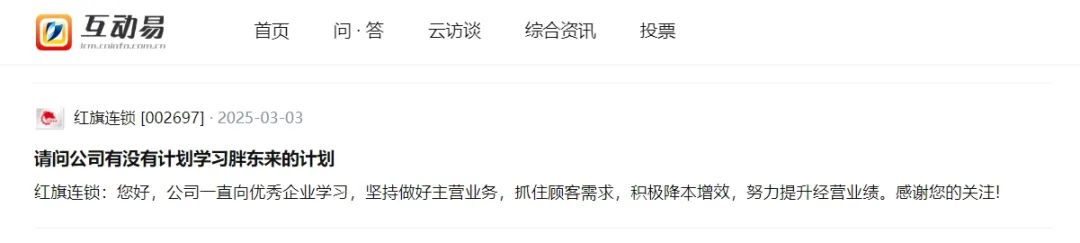 这大概是所有投资者在研究一家地方超市品牌时都会考虑的问题。在深交所投资者互动平台,不少投资者从2024年起就坚持不懈地问红旗连锁:公司有没有学习胖东来的计划?他们始终没有得到正面答复。