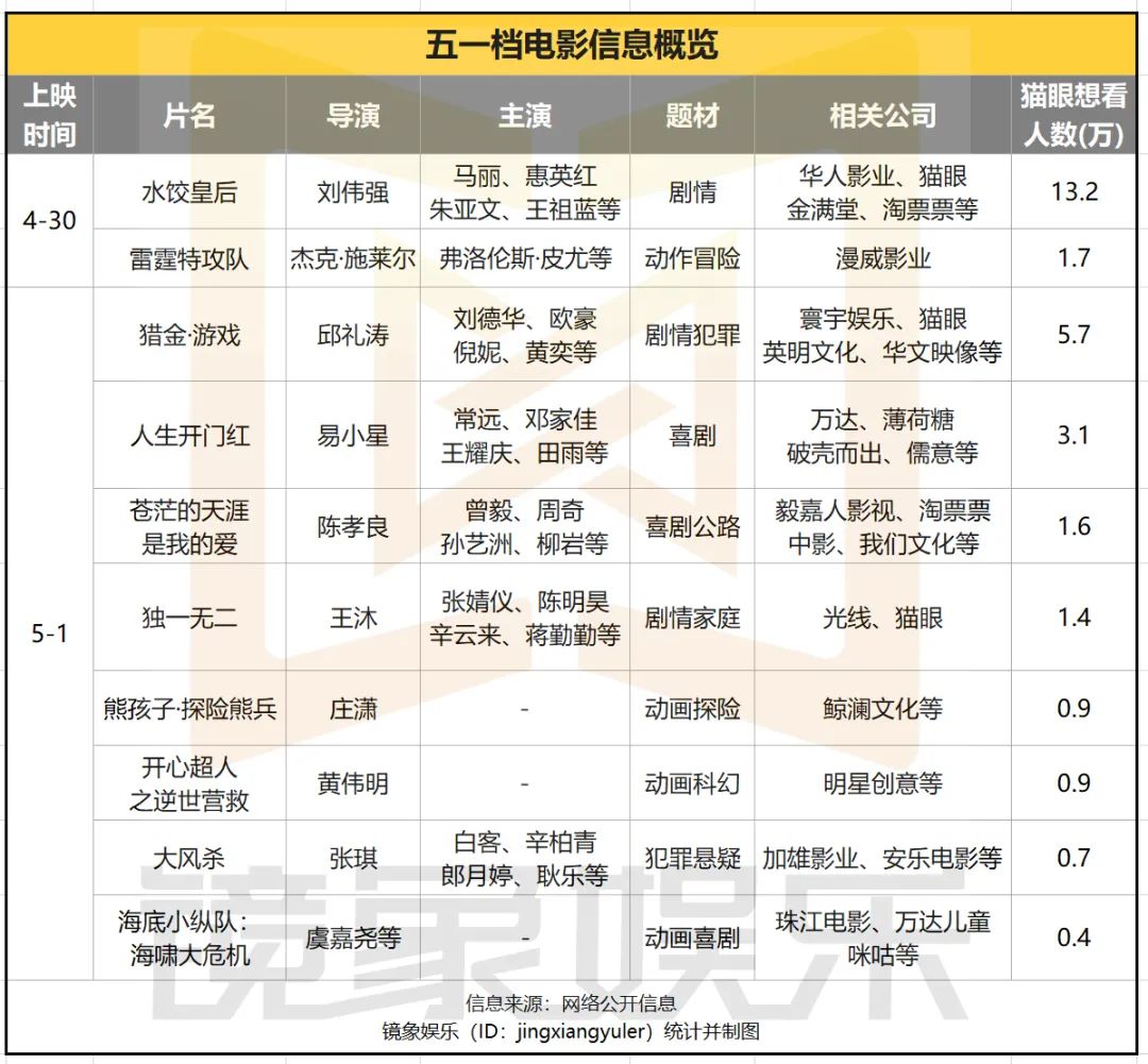 作为时长仅次于春节与国庆的档期,五一档票仓潜力相对更大。截至目前,今年五一已有《水饺皇后》《猎金·游戏》《人生开门红》等10部影片定档,题材覆盖到女性成长、喜剧、动作、悬疑等多种类型。