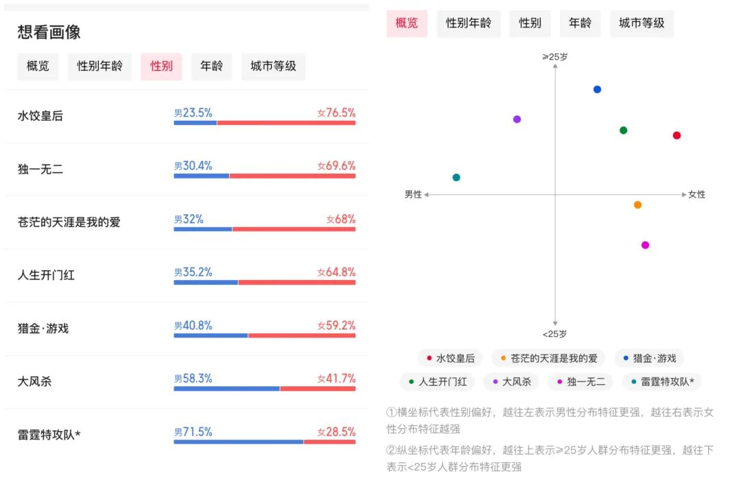 猫眼专业版数据显示,五一档的真人电影中,虽然多数影片仍然延续了女性受众为主的大盘整体走势,但悬疑片《大风杀》、漫威电影《雷霆特攻队》,都呈现出了更为明显的男性向,男性想看人群占比分别达到58.3%和71.5%。而在年龄分布上,影片对应受众的差异化也比较明显。比如同为女性向的《水饺皇后》和治愈家庭片《独一无二》,前者25岁以上的女性观众占比接近50%,而后者则多为25岁以下的女性受众,占比为41.8%。
