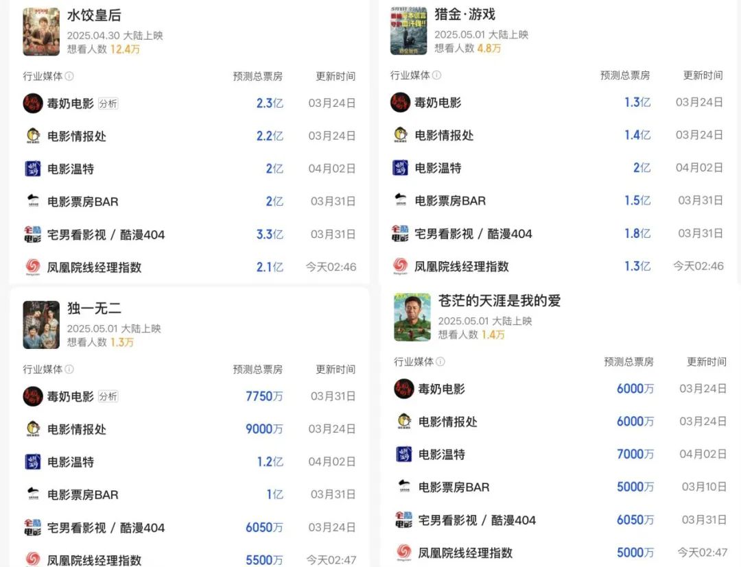 暂列五一档第一梯队的《水饺皇后》由刘伟强监制并执导,罗晓文监制,马丽领衔主演。该片虽题材在档期内具备一定的独特性,以真实人物创业故事和女性逆境励志崛起为核心的设定,也相对更容易引发情感共鸣,但这类影片的票房上限普遍不太高,目前猫眼媒体超前预测票房也仅在2—3.3亿元之间。