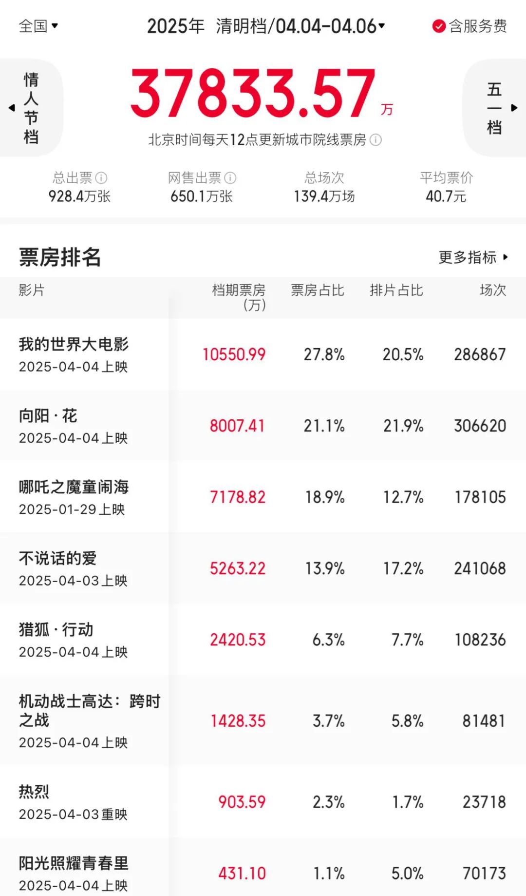 据猫眼专业版数据,2025年清明档(4月4日—4月6日)总票房3.78亿元,较市场预期的接近9亿元缩水近60%,较去年也下滑了54%,创下十年来最低纪录(剔除2022年疫情特殊年份)。而且,档期冠军又双叒叕被引进片收入囊中,即由美国传奇影业和美国华纳兄弟影片公司携手打造的真人版《我的世界大电影》。