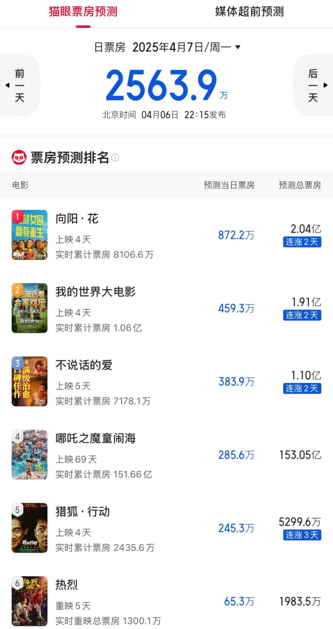 上映首日未能突破5000万大关,档期三天最终的累计票房仅1.06亿元。上映前猫眼想看人数、首日排片率皆遥遥领先的《向阳·花》,只拿到了老二的位置,而预售票房领跑档期的《不说话的爱》与号称2亿元成本的《猎狐·行动》则双双败给了《哪吒之魔童闹海》。