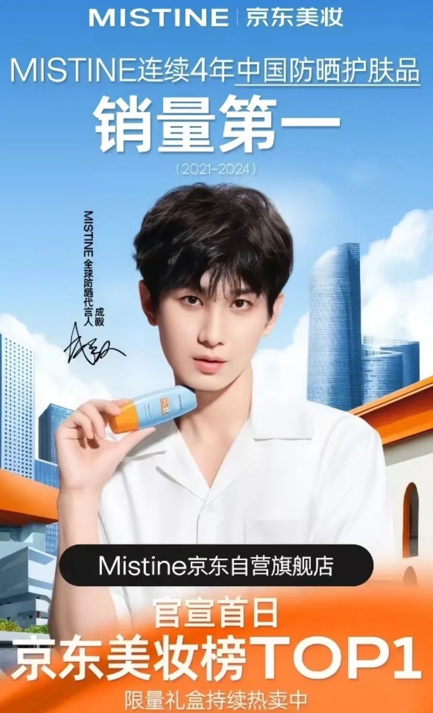 二是,借助流量实现短期的品牌声量与销售爆发。蜜丝婷押注顶流成毅,借助其号召力让品牌声量呈爆发式增长。数据显示,成毅代言后,蜜丝婷户外防晒系列 GMV 突破 5 亿,代言人礼盒上线仅 3 分钟就售罄 10 万份,在京东美妆榜中,相关产品连续 24 小时稳居 TOP1。