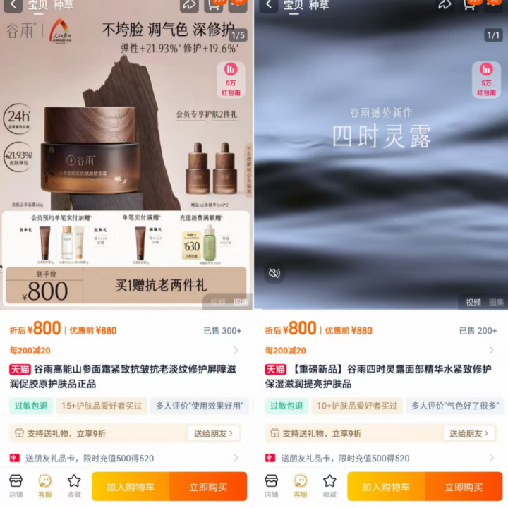 2024年谷雨推出一款“四时灵露净化水”,定价1080元,以及“高能山参面霜”(60g)定价950元,至今叠加优惠券到手价800元。