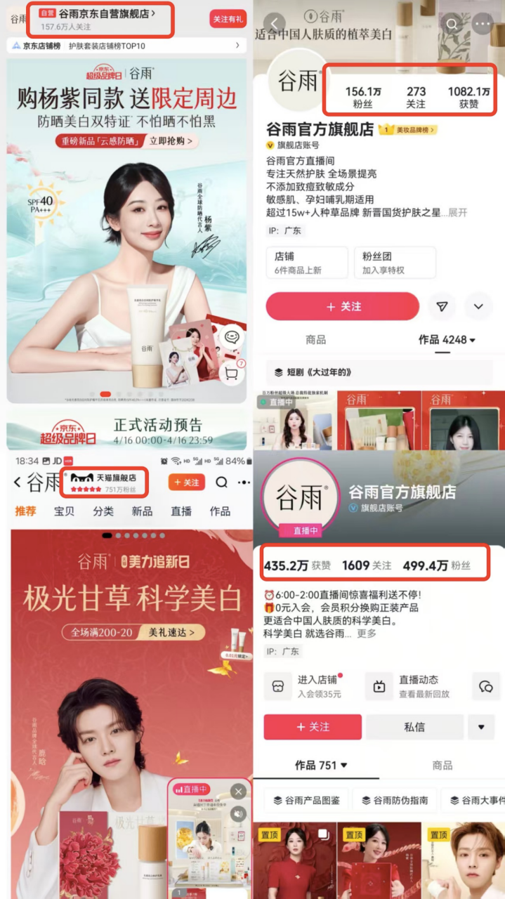2021年至2023年,谷雨的销售额分别突破了10亿元、22亿元和35亿元,2024年的GMV(商品交易总额)则突破了50亿元。此外,2024年4月,谷雨官宣鹿晗为全球品牌代言人,2025年1月,官宣杨紫为全球防晒代言人。