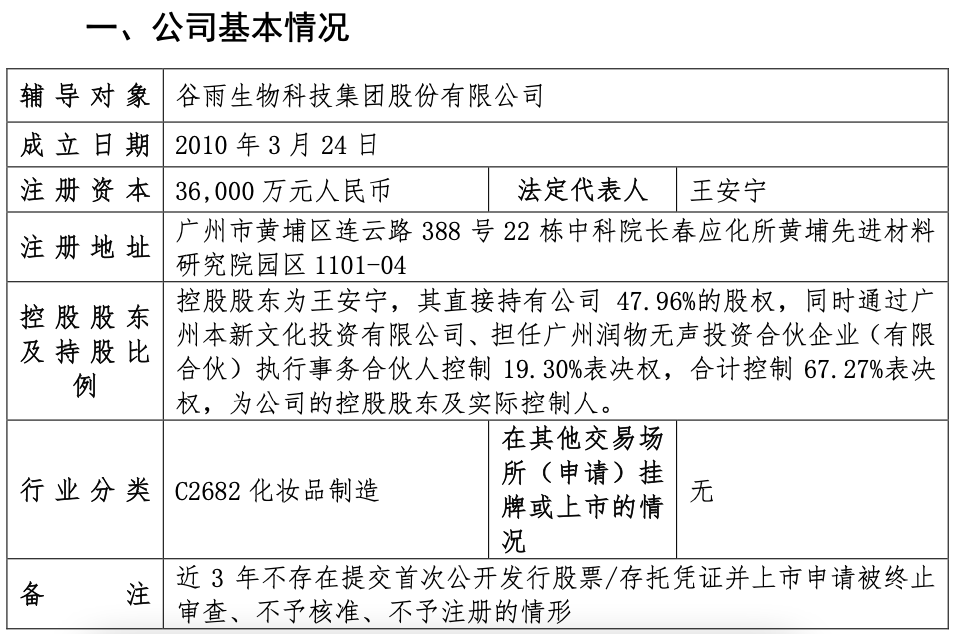 据谷雨此次IPO上市的《辅导备案报告》显示,谷雨的创始人为王安宁,其直接持有公司47.96%股权,并通过广州本新文化投资有限公司及广州润物无声投资合伙企业(有限合伙)控制额外19.3%表决权,合计控制67.27%表决权,为公司控股股东及实际控制人。