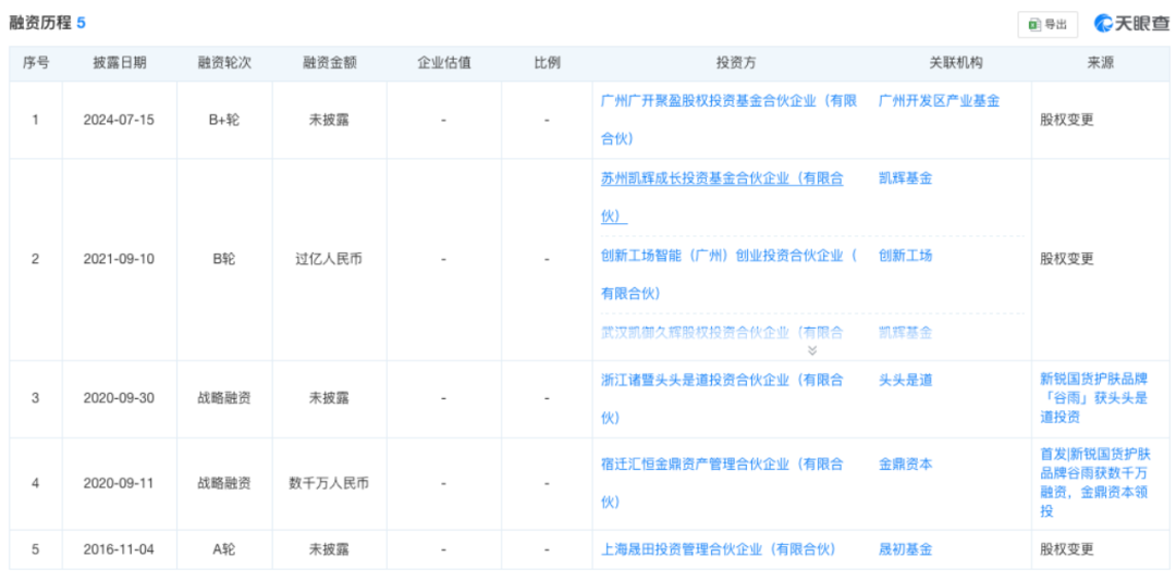 天眼查显示,谷雨自2016年成立以来累计完成5轮融资,投资方包括金鼎资本、凯辉基金、创新工场、头头是道、晟初基金及广州开发区产业基金等,其中凯辉基金背后为美妆巨头欧莱雅,以及雅戈尔等明星企业,创新工场背后则是中国知名企业家李开复。