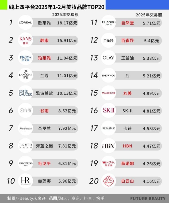 据“FBeauty未来迹”发布的产业报告显示,2025年1-2月,淘天、京东、抖音、快手线上四大平台的所有美妆品牌中,谷雨交易额达8.52亿元,排名第六,超过圣罗兰、海蓝之谜、SK-II等国际品牌。