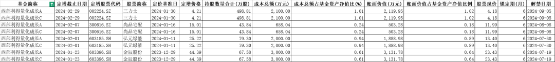 2024年开年前两个月,盛丰衍旗下的西部利得量化成长参与了4家上市公司定增,不过从股价表现看并不理想。wind数据显示,该产品定增的股票分别为三力士(002224.SZ)、尚品宅配(300616.SZ)、弘元绿能(603185.SH)、金辰股份(603396.SH),成本总额1.55亿元,锁定期均为6个月,参与的上述4家上市公司解禁日期分别为2024年的9月5日、8月8日、7月30日、7月19日。截至解禁日收盘,西部利得量化成长参与4家上市公司定增期间,仅弘元绿能实现浮盈,其他3家均浮亏,最大浮亏的是金辰股份,跌幅达50.88%,三力士和尚品宅配的股价跌幅分别为18.14%、6.27%。