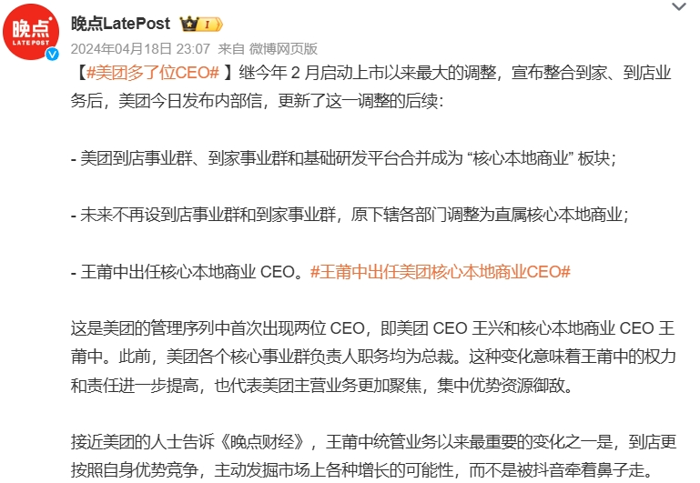 据“趣解商业”了解,王莆中生于1984年,曾担任百度外卖负责人,2015年加入美团后,他的履历集中在到家板块,帮助美团外卖击败饿了么,并带领美团在即时零售领域站稳脚跟;在去年美团组织架构调整后,担任美团最核心业务“美团核心本地商业”的 CEO,同时其也是美团最高决策层 S-team(核心管理团队)中年龄最小的人。
