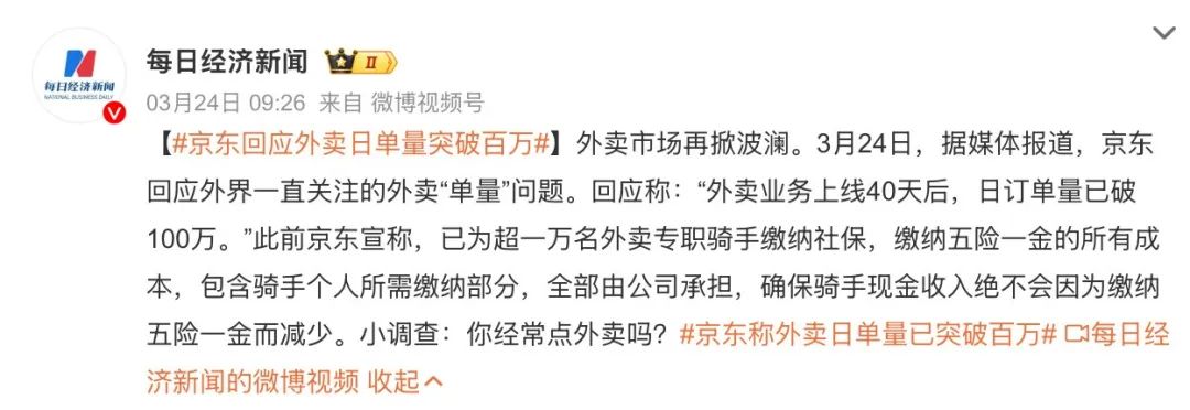 另外,此前据“36氪”等媒体报道,京东外卖在2025年1月降低补贴后,餐饮日单量从高峰期的数十万单暴跌至2万单,仅为美团、饿了么日均单量的千分之一。