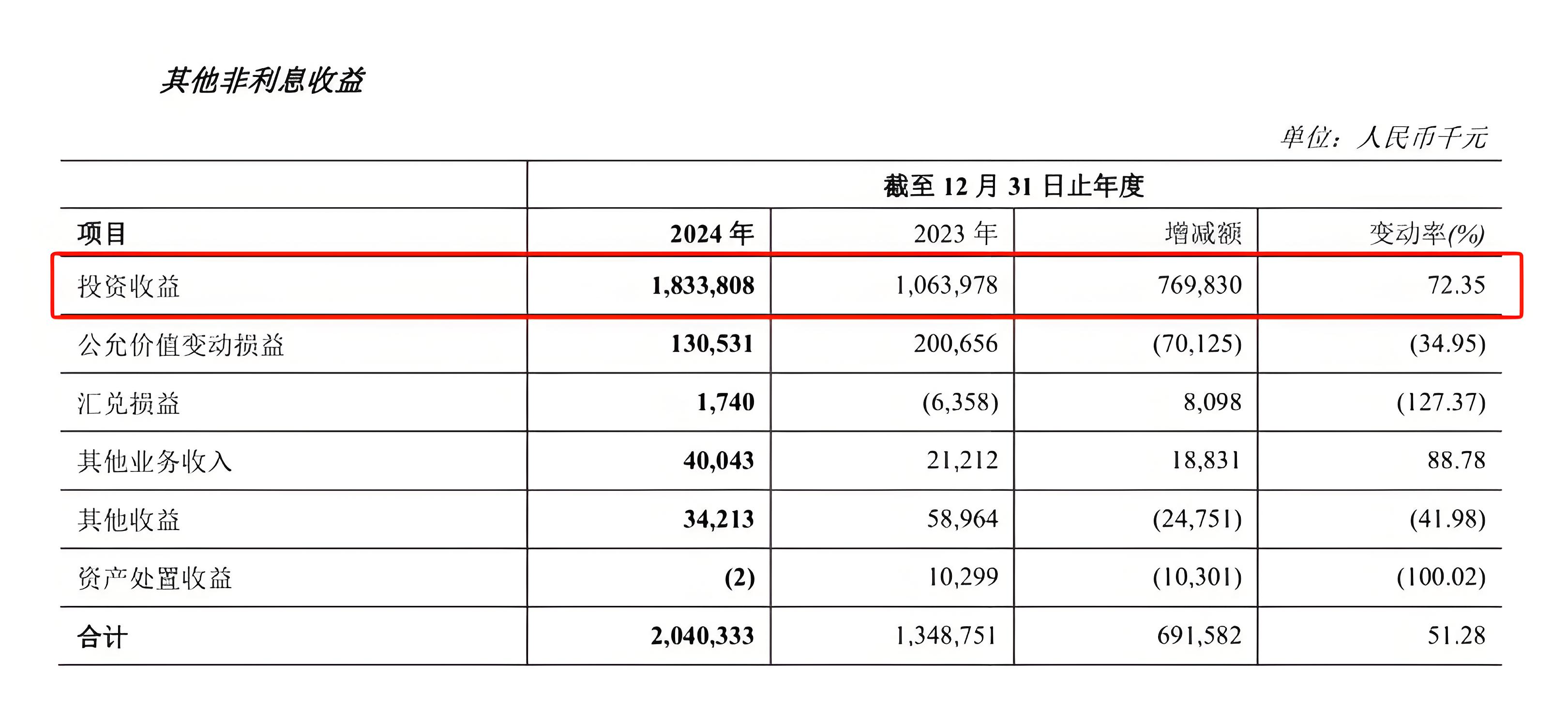 其中,投资收益大幅增加。该行2024年实现投资收益18.34亿元,同比增长7.70亿元,增幅为72.35%,主要是由于以公允价值计量且其变动计入其他综合收益的金融资产净损益增加所致。