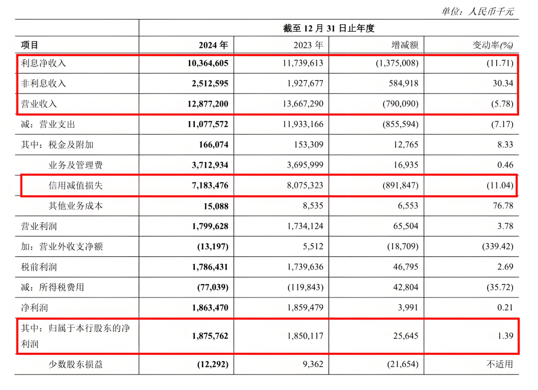 2024年,该行计提信用减值损失为71.83亿元,同比下降8.92亿元,降幅为11.04%。其中,降幅最大的为发放贷款及垫款减值损失,较去年同期下降7.54亿元,降幅为12.80%。