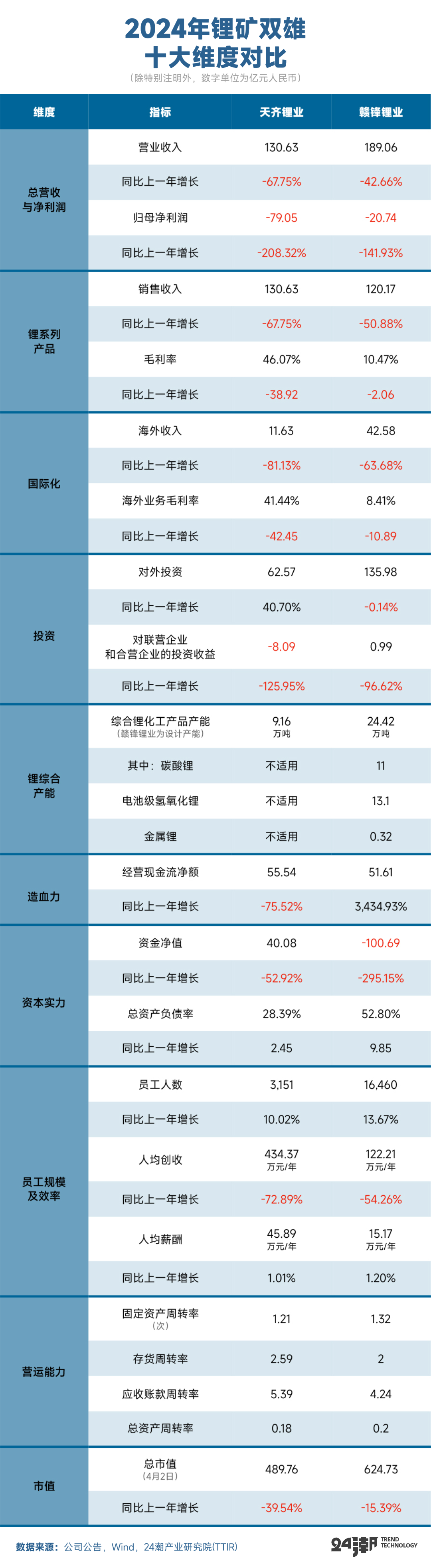 为了方便读者朋友能更为客观、全面的了解锂矿双雄的真正竞争力与潜在风险,24潮团队还统计对比了天齐锂业与赣锋锂业2024年投资布局与收益、造血力与资本实力、国际化与市值变化等多个核心指标,供读者朋友参考。