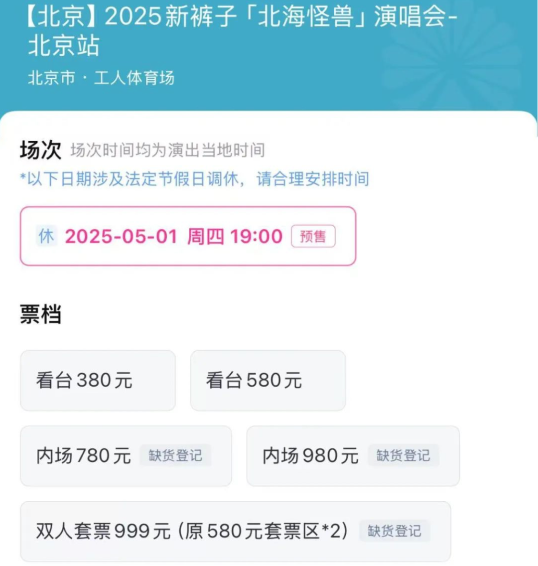如此高频的曝光自然导致乐迷审美疲劳,热门乐队的巡演票也开始卖不动了。比如新裤子今年五一的「北海怪兽」演唱会北京站,到现在380、580的票还没卖完。
