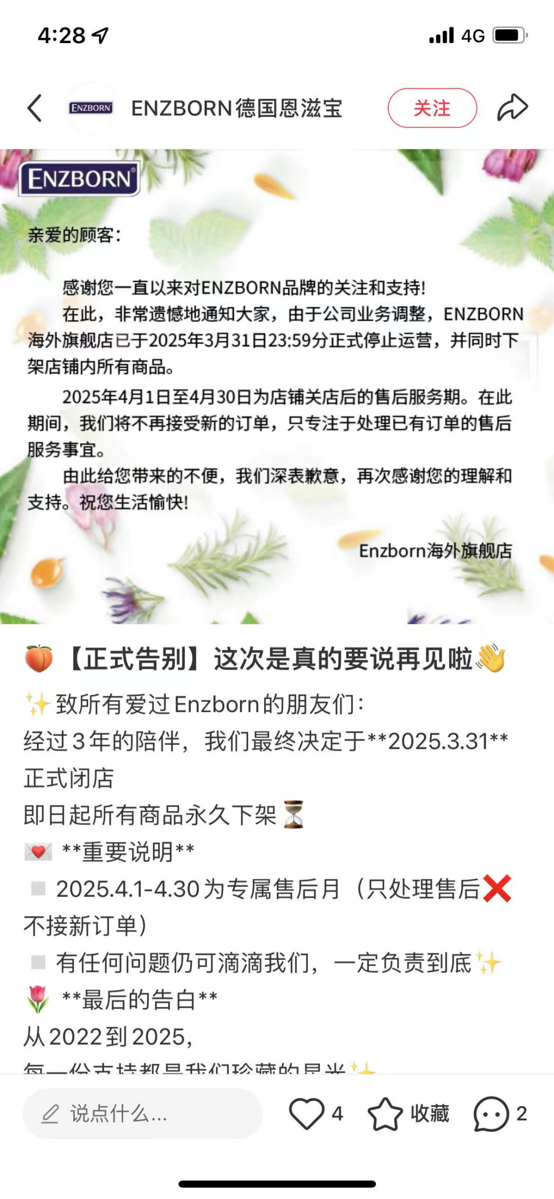前不久,德国植物天然萃取护理品牌ENZBORN恩滋宝通过小红书官方账号宣布,ENZBORN天猫海外旗舰店已于3月31日正式停止运营。