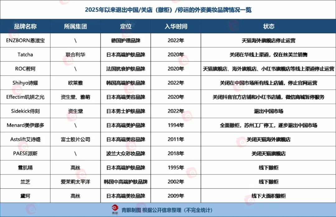 事实上,恩滋宝停运天猫海外旗舰店仅是外资美妆品牌在华“不吃香”现象的一个缩影。据青眼不完全统计,今年以来,已至少有12个外资美妆品牌出现退出中国/关店/撤柜的情况。这也反映出,外资美妆在中国“躺赢”的时代已经结束。