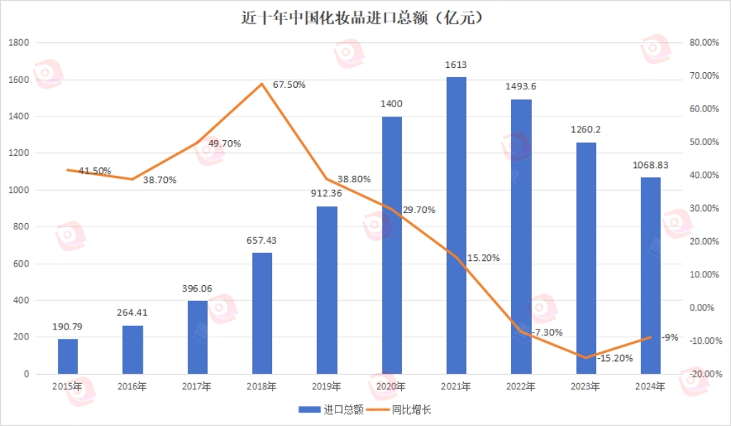 从数据上来看,更能够直观感受到上述趋势变化。青眼通过梳理近10年中国化妆品进口总额数据发现,2015年至2018年,进口化妆品总额整体呈现出高速增长阶段,每年的同比增长率均在38%以上,且在2018年达到了峰值,同比增幅高达67.5%。从2019年开始,进口化妆品总额增速就开始逐步放缓,不过进口总额仍保持增长势态。从2022年起,我国开始进入到进口化妆品的“负增长时代”,进口化妆品总额呈现同比下滑。2023年化妆品进口总额更是同比下滑15.2%,创下十年新低。