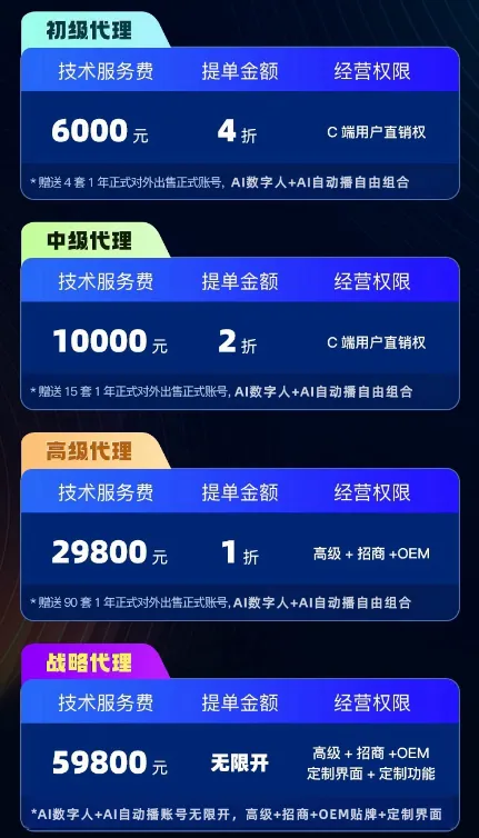 徐铭表示,该数字人软件服务商极力推荐的代理模式分为四种级别,可以根据个人需求和资金能力进行选择。