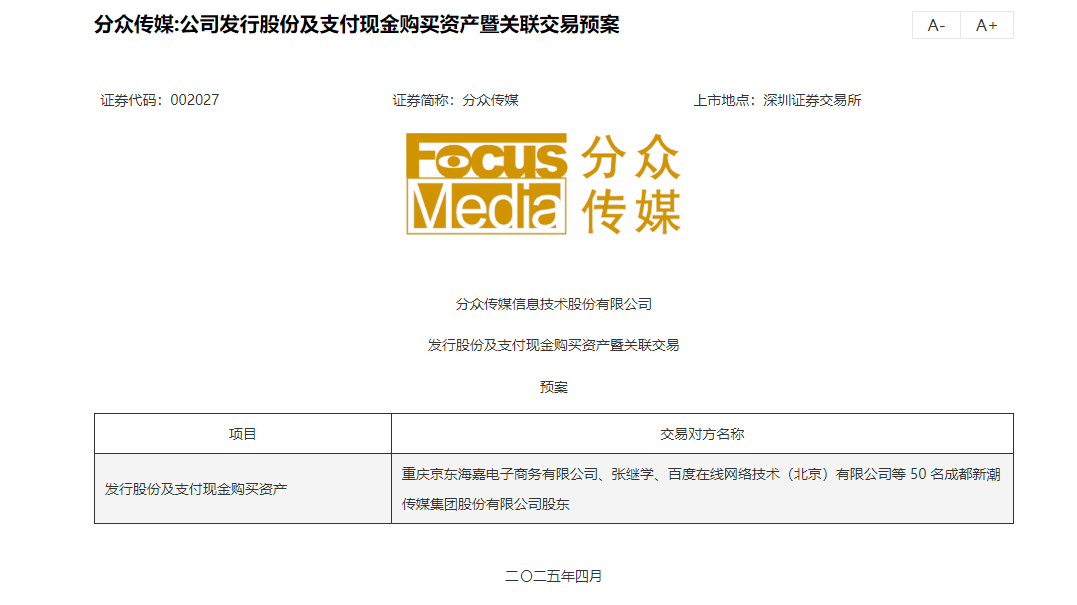 4月9日晚间,分众传媒披露重组预案,公司拟以发行股份及支付现金的方式,购买张继学、重庆京东、百度在线等50个交易对方持有的新潮传媒100%股权。经初步协商,新潮传媒100%股权预估值为83亿元。