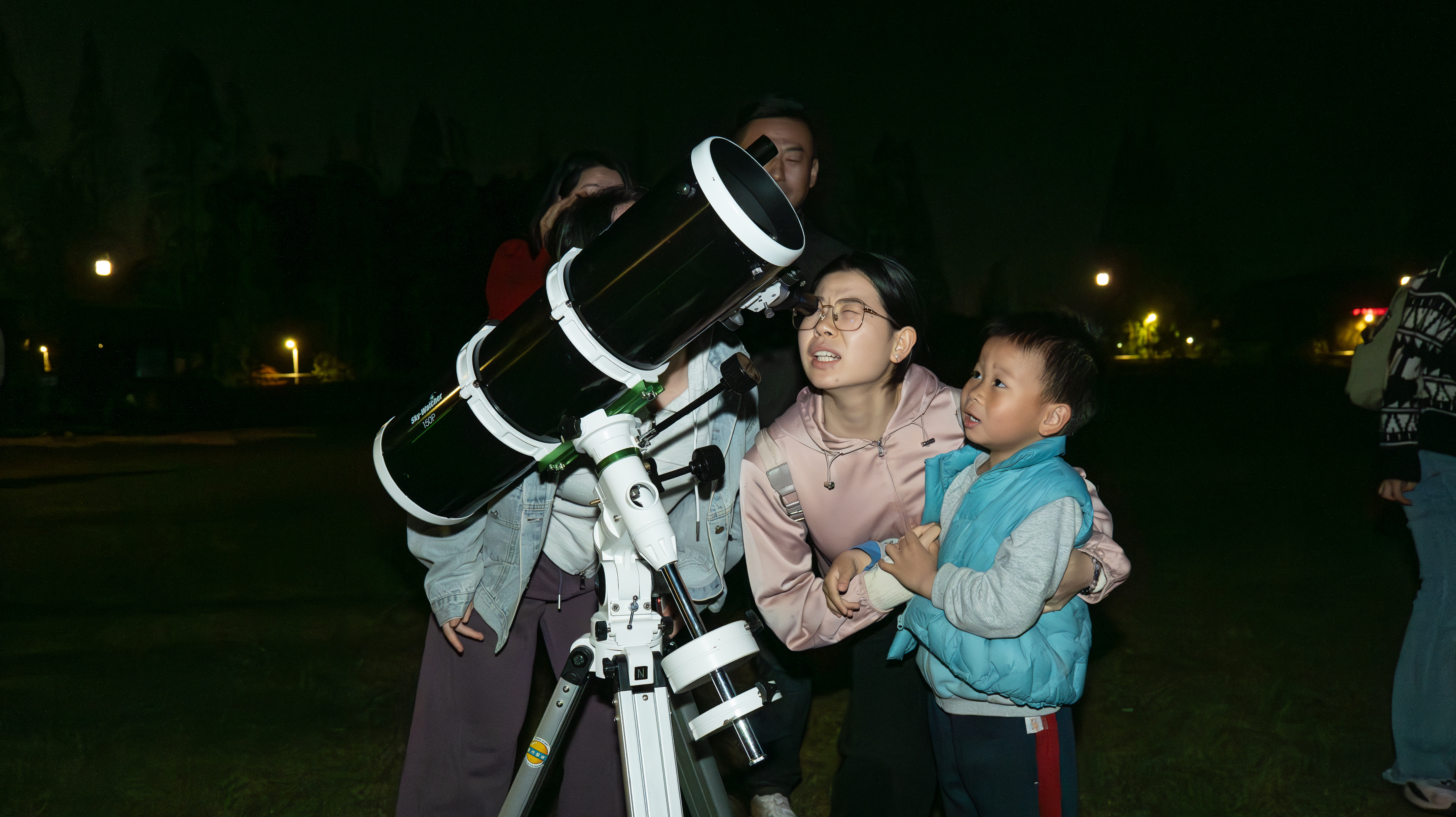 当暮色浸染,在墨柠创始人、宁波市天文科普讲师郭皓老师的指导下,亲子家庭解锁宇宙密码,学习星盘知识,通过肉眼看到了北斗七星、大小天狼星、福禄寿三星高照、昂星团等等,通过天文望远镜,木星与四颗伽利略卫星、满月表面的环形山、月海相继映入眼帘。当郭老师以激光笔勾勒出“天蝎座”,孩子们发出阵阵的欢呼,全场气氛嗨翻天。