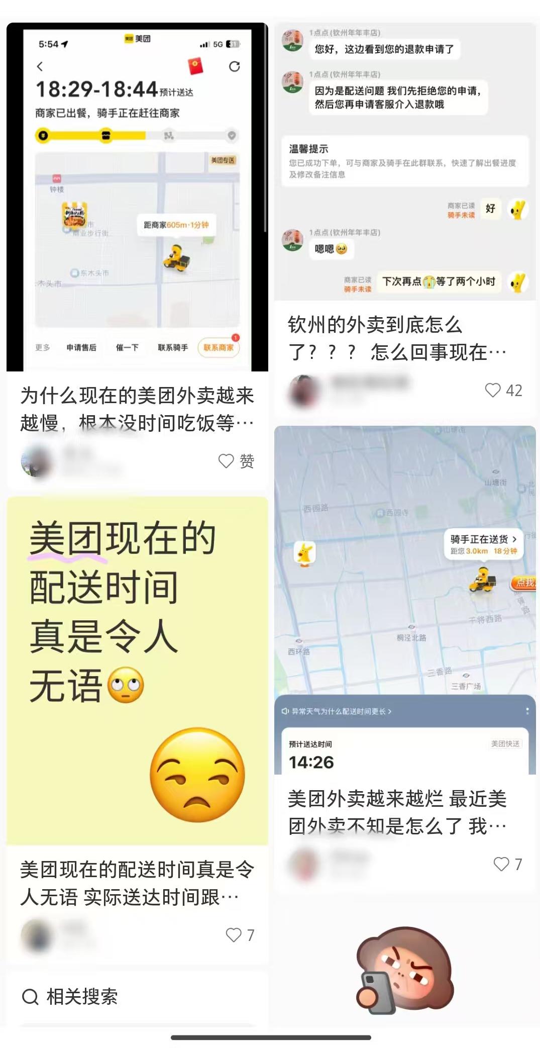 在小红书上,有不少人抱怨,实际送达时间跟下单时显示的预计送达时间差距很大、在没有任何提示的情况下自动延迟半小时、甚至有人质疑,明明自己已经看到外卖员提前二十分钟就已经到楼下了,但非要等到“准时宝”快要生效的前两分钟才优哉游哉地踩点送到。“我点的早餐直接都能当午餐吃了。”