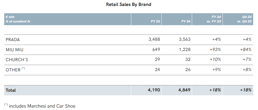 虽然Prada集团在2024实现逆流而上,但仔细观察可以发现,集团的创收引擎变为突飞猛进的Miu Miu,核心Prada落于下风,Prada品牌实际也进入让消费者审美疲倦、增收放缓的危险地带。