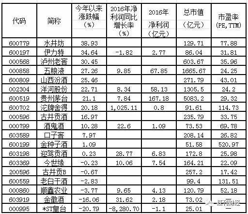 除了贵州茅台外,还有10家公司公布2016年度业绩。部分一线名酒2016年实现了营收和净利润的双增,而其它区域名酒表现也不示弱。从营收增长率来看,五粮液、顺鑫农业和沱牌舍得均实现了10%以上的增长;净利润增幅方面,沱牌舍得的增幅最大,在报告期内,公司净利润增幅为1025%。相反,伊力特和*ST皇台业绩处于亏损状态。