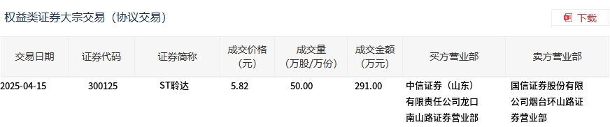 ST聆达今日大宗交易折价成交50万股,成交额291万元