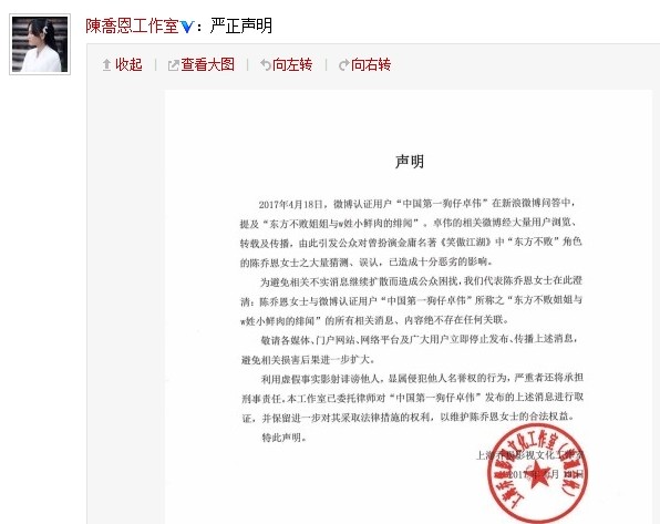 陈乔恩发声明否认与W小鲜肉绯闻:已对卓伟取证