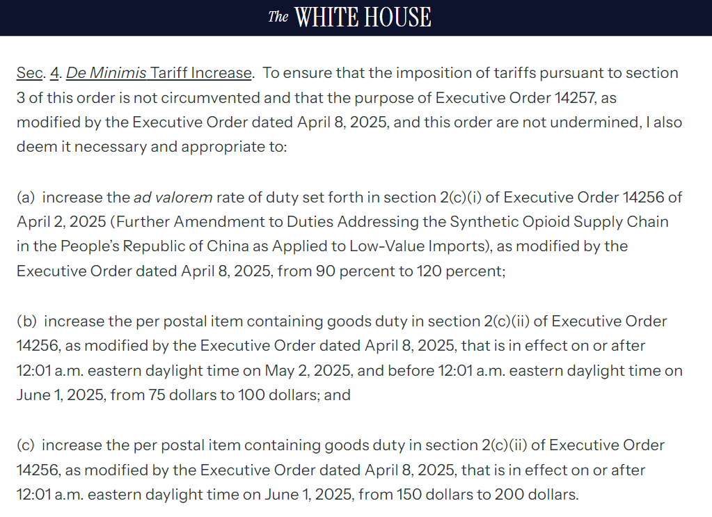 更重要的是,还有一则与“对等关税”一同宣布的消息,即对中国内地和中国香港小额进口商品关税豁免政策的取消。后者也经历了层层加码——最初是征收30%或每件25美元的关税,6月1日后上调至每件50美元;现在则是征收120%或每件100美元的关税,6月1日后上调至每件200美元。虽然生效时间还是5月2日,面向的依然是货值不超过800美元的包裹,税率却又翻了三倍。