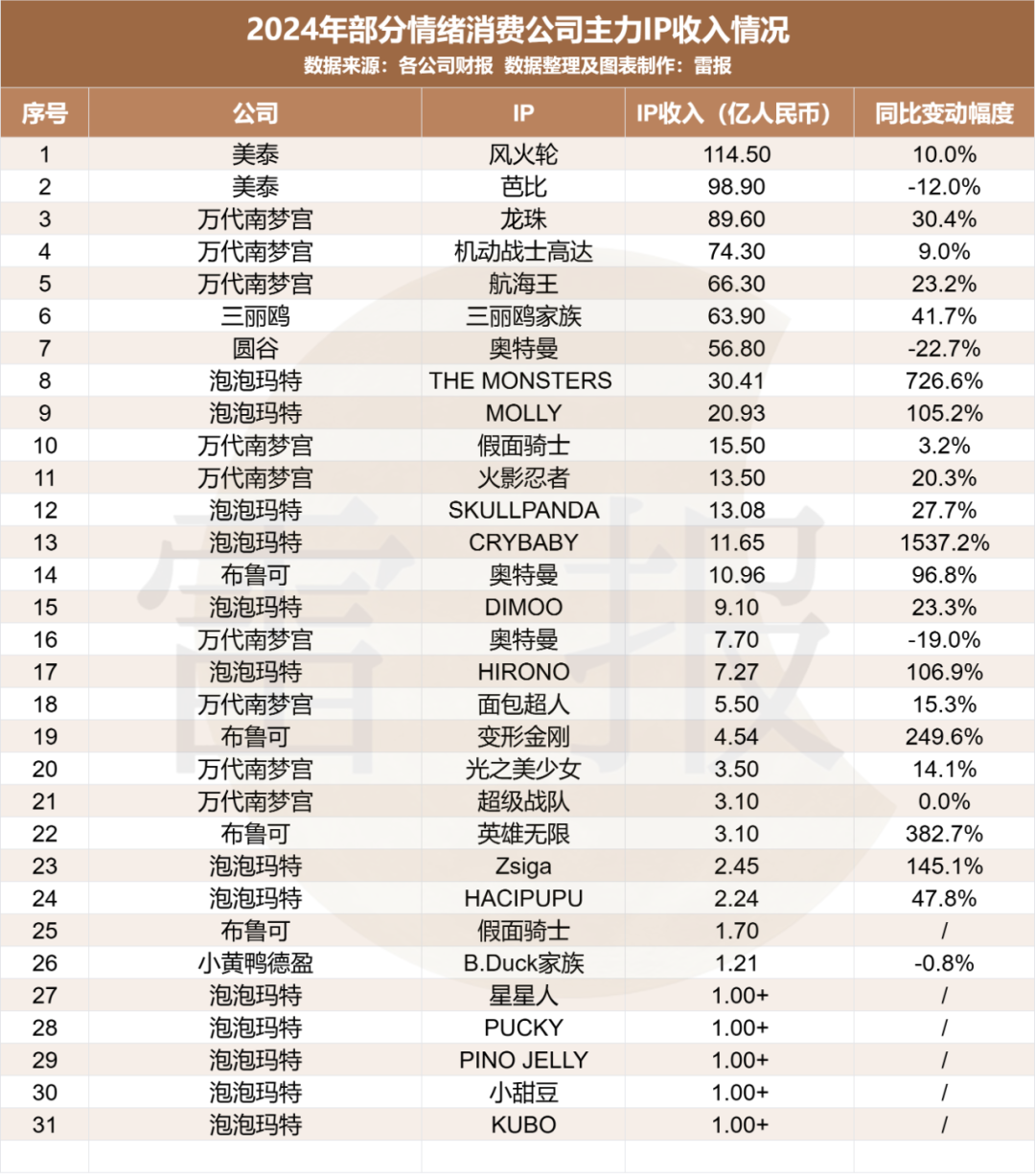 在泡泡玛特及其他国内外玩具巨头的财报里,部分IP的销售数据得以公布,从而直观地体现出IP所能释放的强大商业能量,雷报统计如下:
