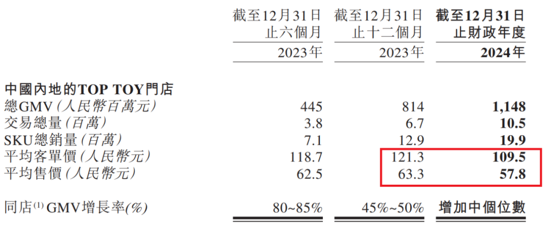 粗略计算,在中国内地市场,名创优品2024年的单店月均GMV为26.6万元,同店GMV下滑了高个位数。旗下的TOPTOY单店月均GMV虽然更高,为35.2万元,但较上年减少了25%,同店GMV增长率也由上年度的45%-50%下滑至“中个位数”。此外,TOP TOY的平均客单价、平均售价均同比有所减少。而同期,泡泡玛特国内线下零售店的单店月均收入约为79.5万元,较上年同比增长了30%。