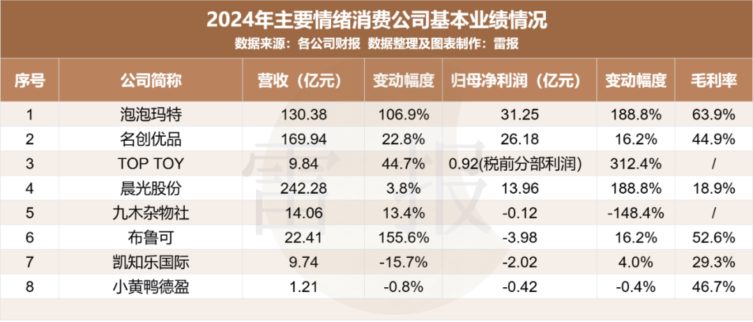 “情绪消费”是近年消费市场上的热词。近期,泡泡玛特、名创优品、布鲁可、晨光股份、凯知乐、小黄鸭德盈等业务涉及情绪消费的上市公司相继发布2024年业绩报告。在这场热情高涨的情绪消费狂潮中,同样都紧跟所谓的风口,但相关公司的业绩表现却呈现显著差异,有的营收净利双双翻番,有的增收却不增利,还有的甚至陷入停滞和衰退,具体情况如下表:
