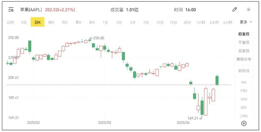 图:苹果股价走势图(截至北京时间2025年4月15日)来源:老虎证券