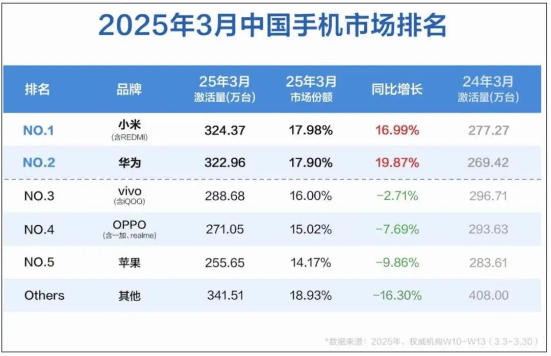 图:2025年第一季度中国大陆手机市场的激活量排名