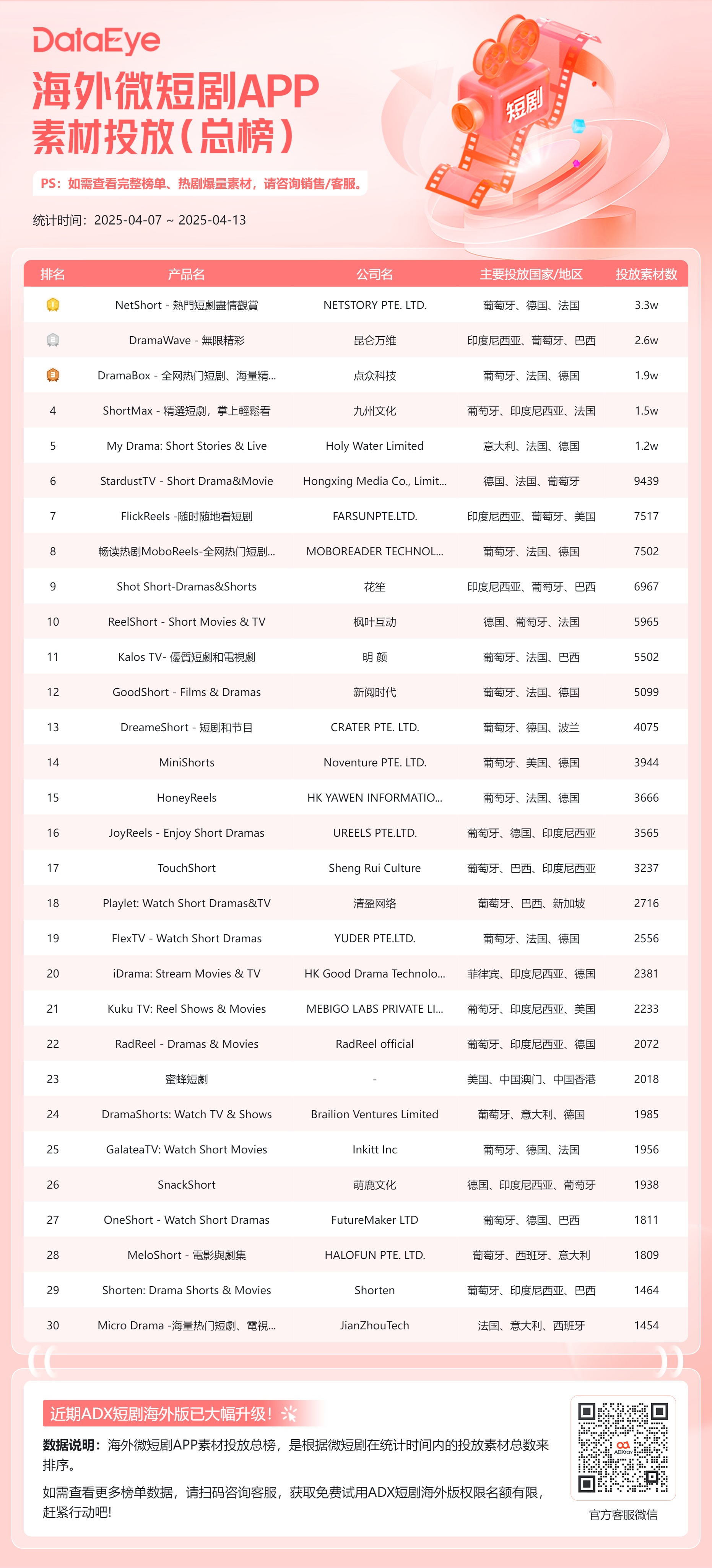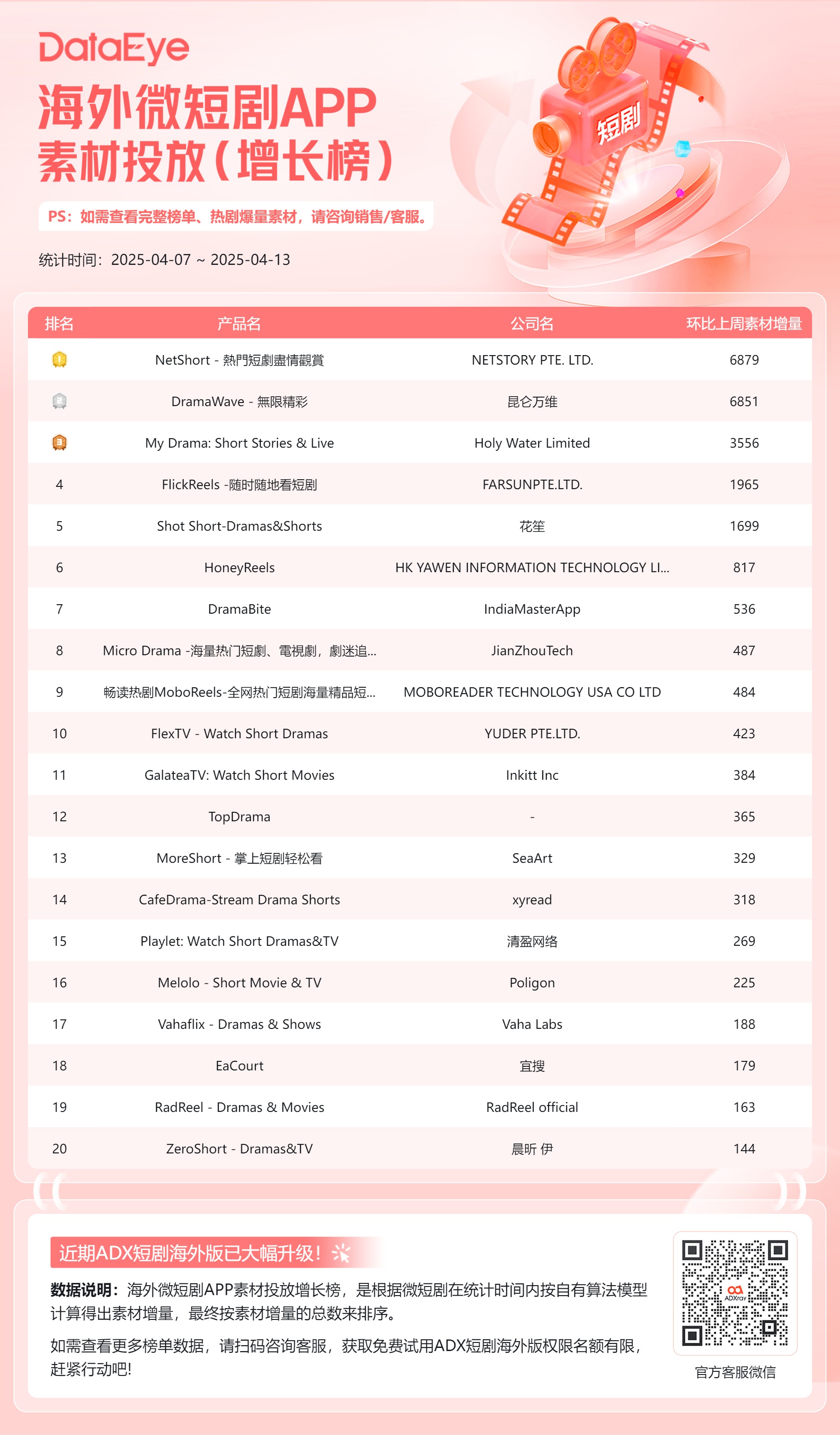 本期(4月7日-4月13日)DataEye海外短剧APP素材投放增长榜,NetShort第一,DramaWave第二,My Drama位列第三。