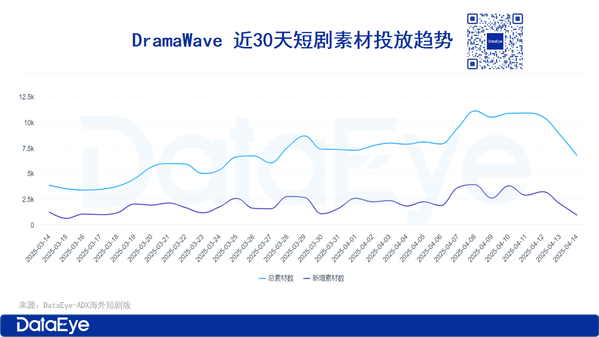 4月初前,DramaWave的日均素材投放量为5000-8000组,4月上旬达到高峰,素材投放量突破1万组,日均新增素材也也提高至2000-4000组左右。