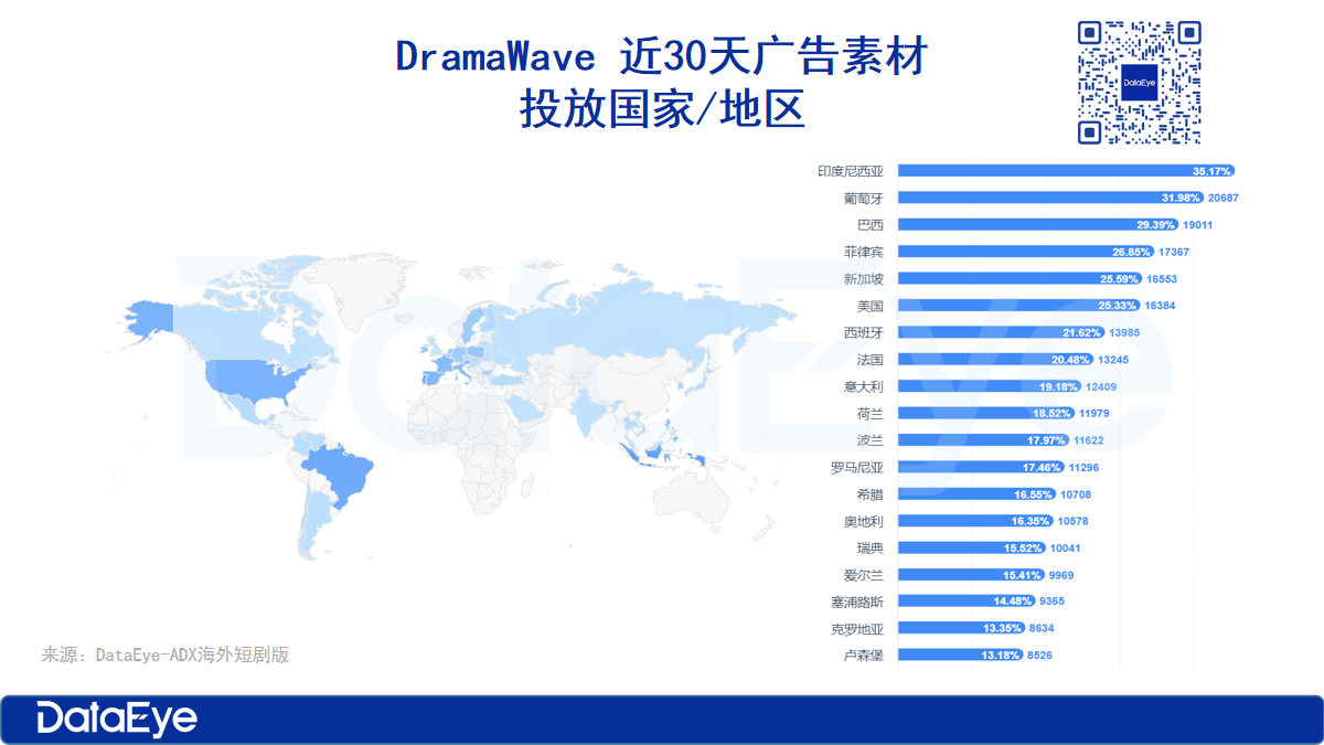 可以看出,DramaWave的主要投放市场范围较广,涵盖东南亚、欧洲、美洲等地区。