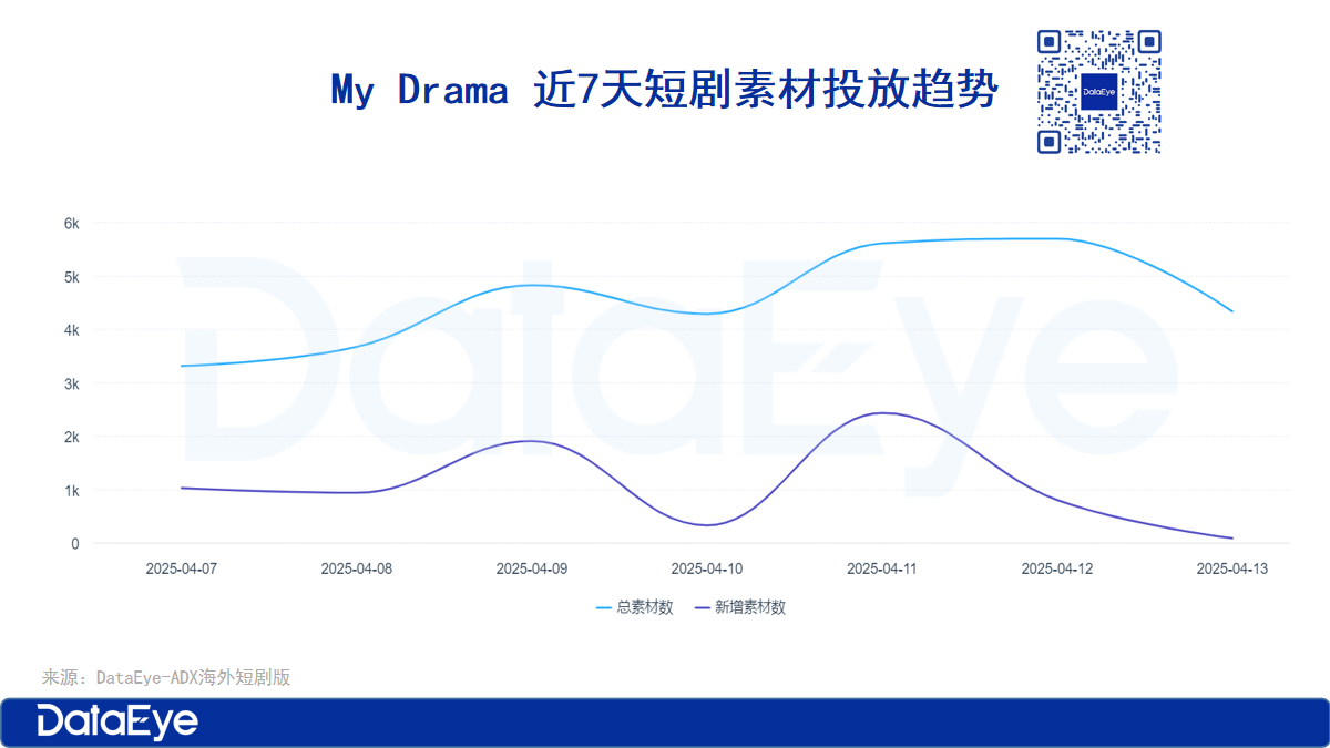 近7天,My Drama的日均素材投放量有大幅上涨,从3000+组升至接近6000组,于4月12日达最高值5693组。