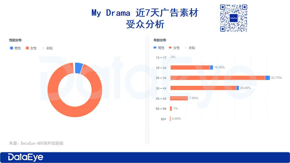 从投放受众来看,My Drama的女性用户占比93.98%,男性用户占比5.04%。同时,25-34岁的用户占比最高,达42.73%;35-44岁的用户次之,占比为29.49%;18-24岁的用户占比18.46%。可以看出,18-44岁的女性是My Drama的主要受众。