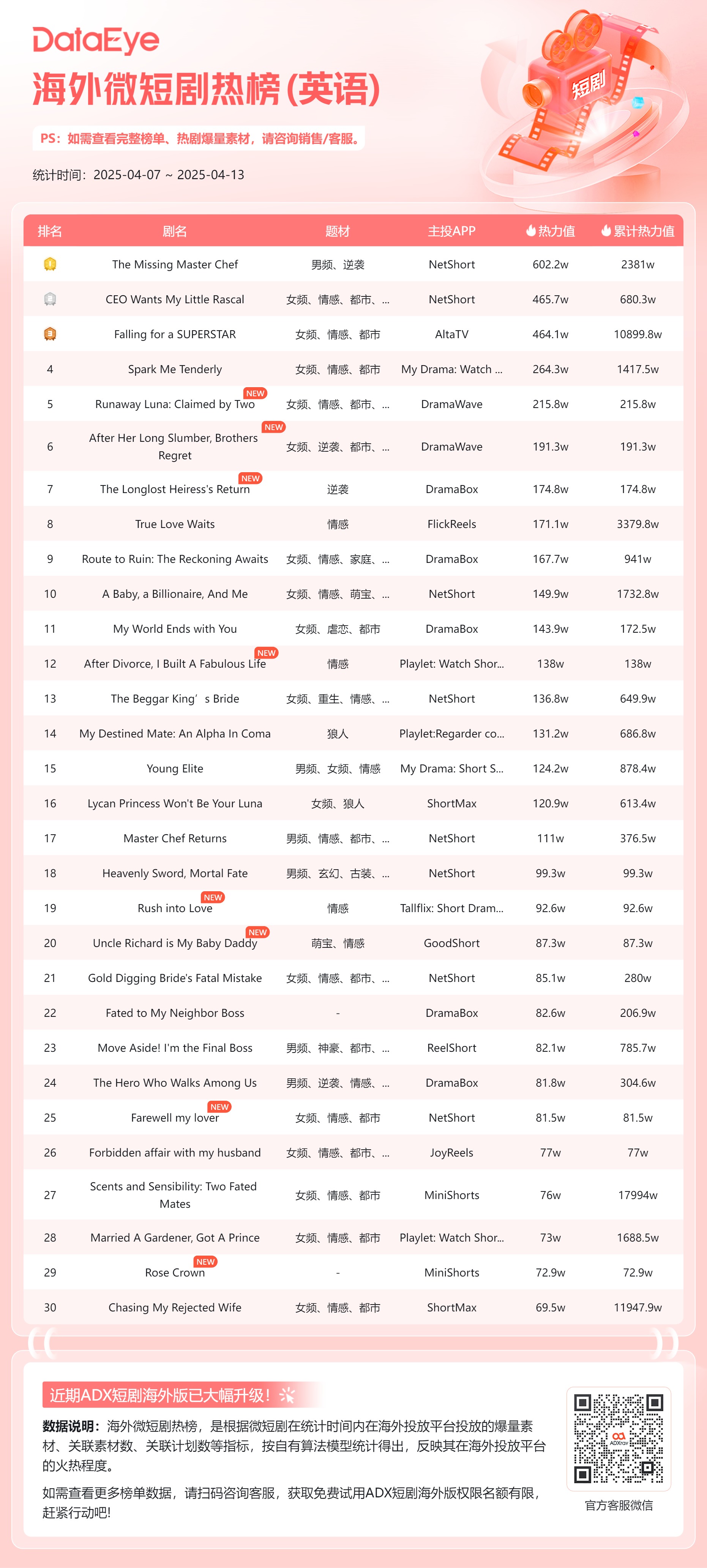本期(4月7日-4月13日)DataEye海外英文短剧热榜,《The Missing Master Chef》登顶;《CEO Wants My Little Rascal》第二;《Falling for a SUPERSTAR》位列第三。共有6部新剧上榜。