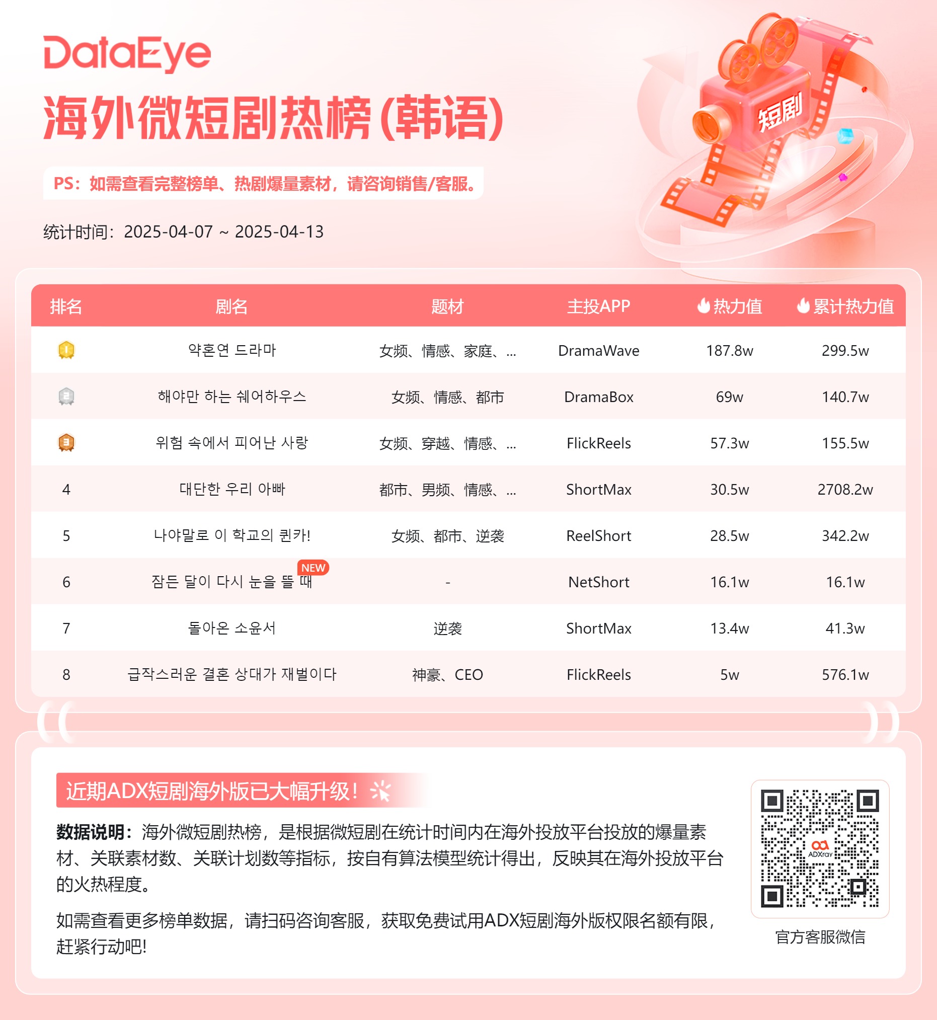 本期(4月7日-4月13日)DataEye海外韩文短剧热榜,短剧《약혼연 드라마》第一;《해야만 하는 쉐어하우스》第二;《위험 속에서 피어난 사랑》位列第三。本期共有1部新剧上榜。