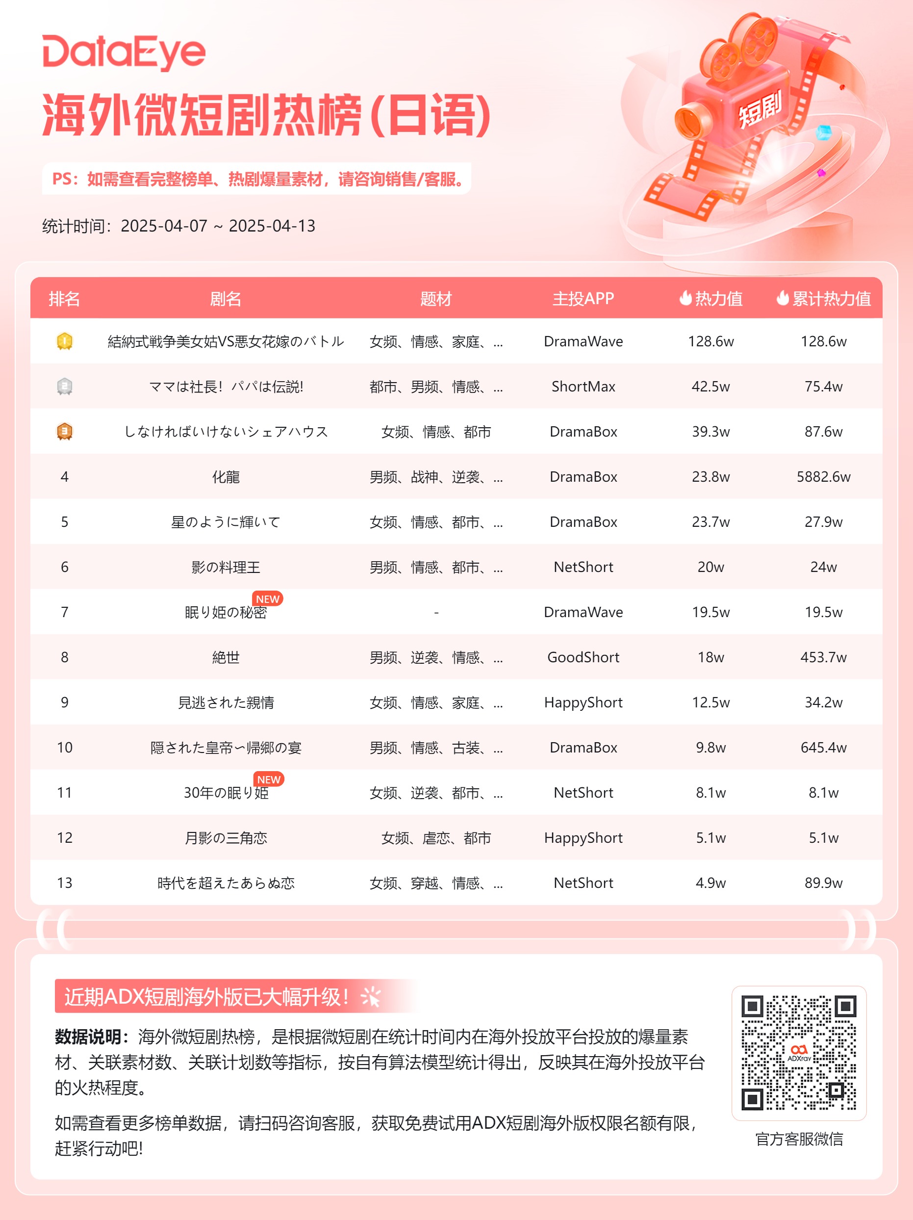 本期(4月7日-4月13日)DataEye海外日文短剧热榜,《結納式戦争美女姑VS悪女花嫁のバトル》登顶;《ママは社長!パパは伝説!》第二;《しなければいけないシェアハウス》位列第三。本期有2部新剧上榜。