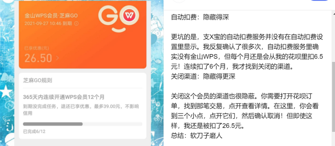 除此之外,WPS的自动续费陷阱也遭到不少网友吐槽。其优惠价通常仅限首年,次年起自动按原价续费。有网友开通连续扣费会员后,想取消时却发现中途退出需要退还之前享受的优惠金额,十分不划算。而且,自动续费的取消流程复杂且隐蔽,其自动扣费服务并未在支付宝或微信的自动扣费设置中显示,用户需要联系苹果客服或打开相应交易订单,点开查看详情才能找到关闭渠道。