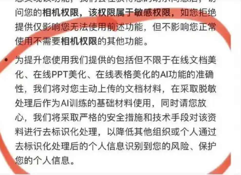 WPS曾被指有权使用用户上传的个人数据档案作为AI大模型的训练素材,此事引发网友的强烈谴责。