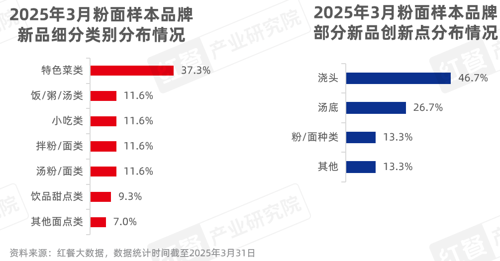 2025年3月,各粉面品牌的创新积极性对比2月有显著增加,新品数量环比上涨16.2%。从新品的细分类别来看,当月粉面新品涵盖的类别有特色菜类、饭/粥/汤类、小吃类、拌粉/面类、汤粉/面类、饮品甜点类、其他面点类。从新品细分类别分布情况来看,特色菜类的新品数量占比为37.3%;其次为饭/粥/汤类、小吃类、拌粉/面类、汤粉/面类,数量占比均为11.6%;饮品甜点类和其他面点类的上新数量占比分别为9.3%和7.0%。