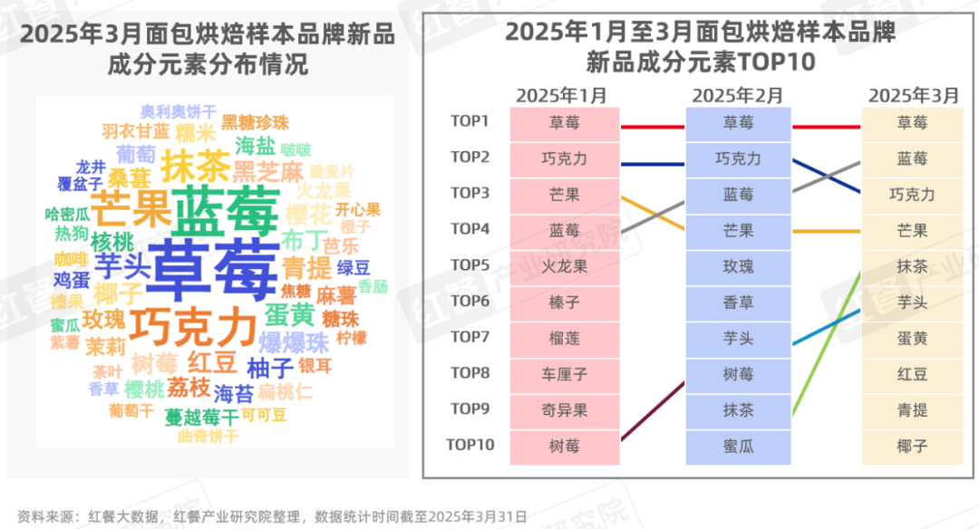 在2025年3月的面包烘焙新品中,草莓、蓝莓、巧克力、芒果等食材元素的使用率最高,并在近3月内稳居前列。而抹茶、芋头、红豆等中式元素入围TOP10。