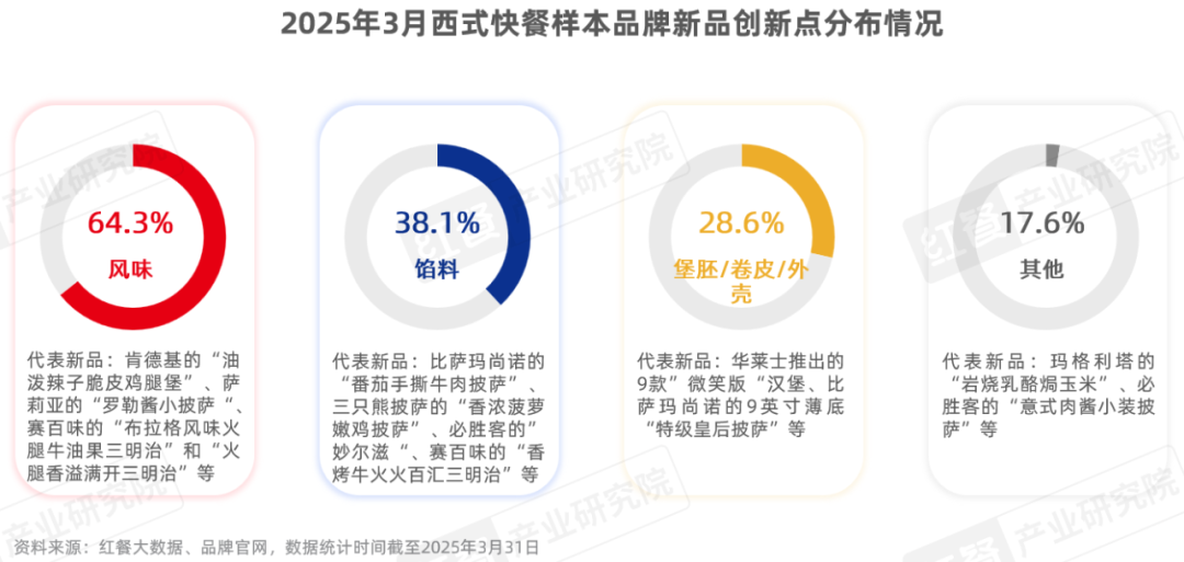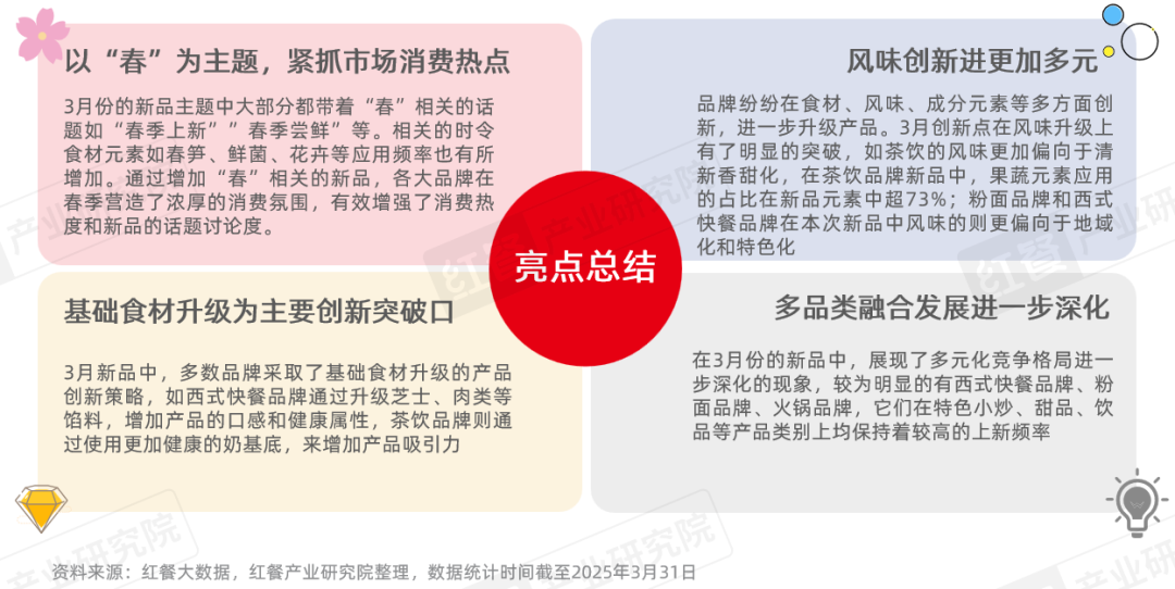 总体而言,2025年3月六大品类的新品数量环比显著提升,同时各大品牌通过紧抓春季上新热度、升级基础食材、风味升级、多品类融合等方面多元创新,为消费者带来了新鲜体验。